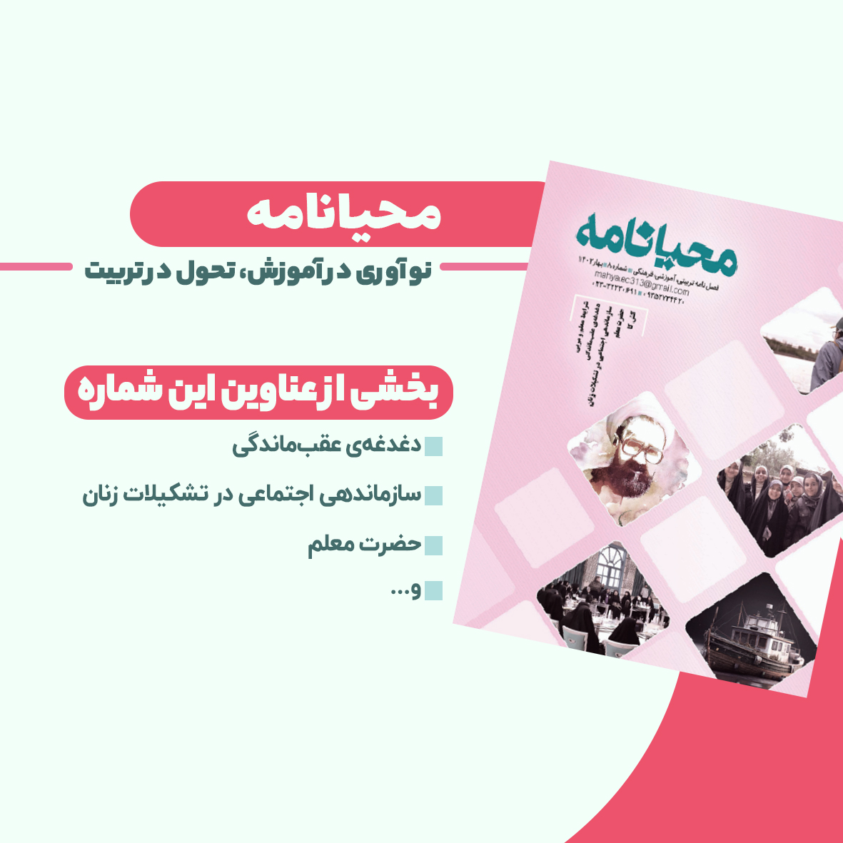 محیانامه – شماره هفتم هفتمین شماره از فصلنامه «تعلیموتربیت، زن و خانواده» با محوریت تربیت، نقش مربی و سازماندهی اجتماعی…